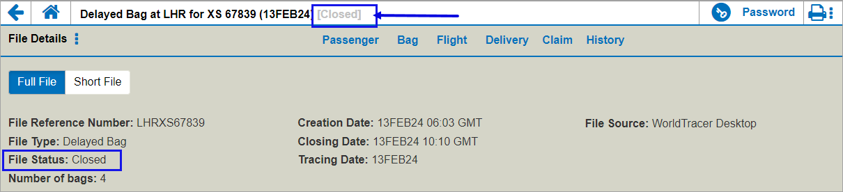 When an agent displays or updates a closed bag file, the Closed status in the file header is displayed in gray, to remind the agent that the file is closed.