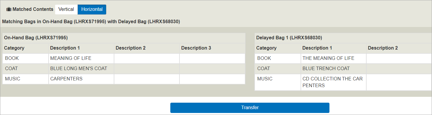 For system matches of a Delayed Bag File with an On-Hand Bag, and both files contain bag contents.