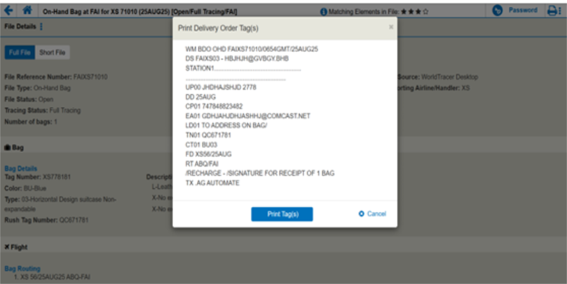 Generate and print a BDO bag tag with a bar code for all Bag Delivery Order files. You have the option to print a BDO bag tag when the Bag Delivery Order files has been created.